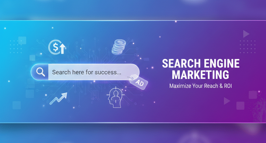 “Search Engine Marketing (SEM) banner with search bar, ad label tag, bidding icons, dollar sign, target audience symbol, bright gradient blue–purple background, futuristic digital UI theme, perfect for website header, HD, 1920×600”